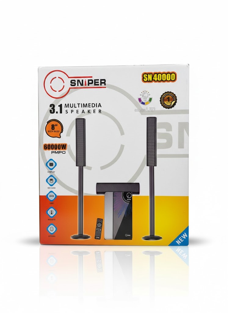 نظام الصوت سنايبر (Sniper) 3.1 هو نظام مسرح منزلي يجمع بين الأداء القوي والتصميم العصري، ويتميز بقدرته على توزيع الصوت بشكل محيطي بفضل تكوين السماعات الثلاث مع مضخم الصوت (Subwoofer).
