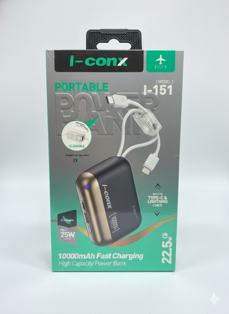 أيقونز (I-CONX) بسعة 10000 مللي أمبير هو شاحن محمول سلكي مدمج وعملي مصمم للاستخدام اليومي، يتميز ببطارية ليثيوم بوليمر عالية الكفاءة، ومنافذ إخراج مزدوجة USB-A بقدرة