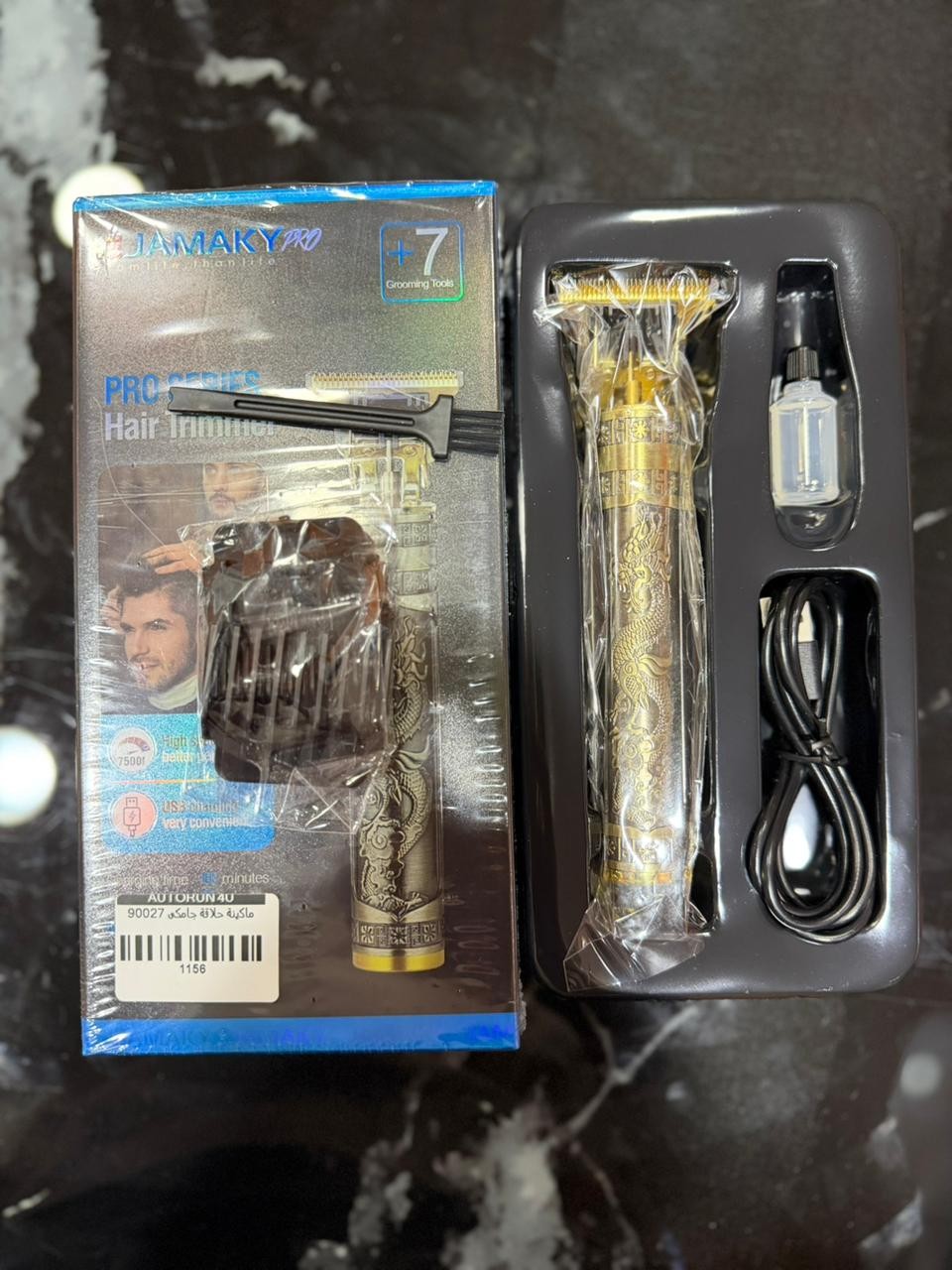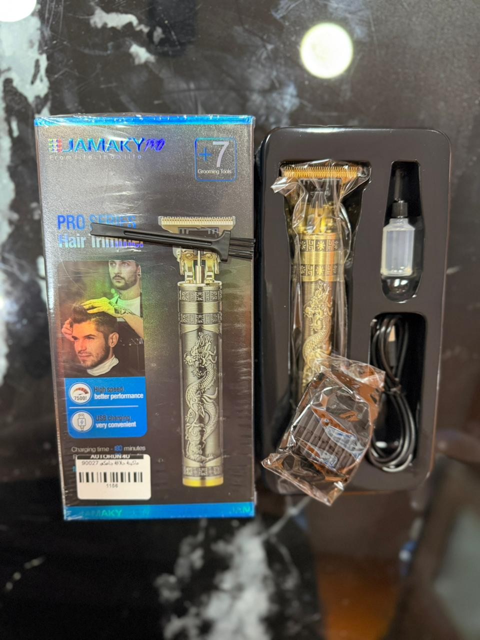 ماكينة قص وتشذيب احترافية، غالبًا ما تكون لاسلكية وتأتي مع مجموعة متنوعة من الملحقات مثل الأمشاط وزيت التنظيف وكابل الشحن. تتميز بأداء قوي، وشفرات دقيقة (أحيانًا من الستانلس ستيل أو السيراميك)، وعمر بطارية طويل، وقدرتها على توفير قص احترافي للشعر واللحية في المنزل.