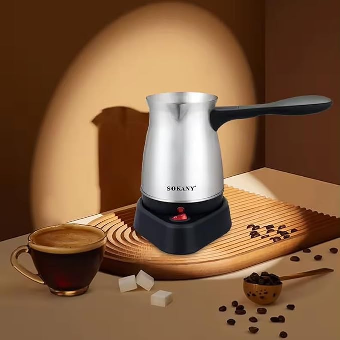 ماكينة القهوة التركية SK-214 من سوكاني هي جهاز كهربائي من الستانلس ستيل بلون فضي، مصمم لتحضير القهوة التركية بسرعة وفعالية. تتميز بقوة 600 وات، وسعة تصل إلى 500 مل، مما يكفي لعمل ما يصل إلى 5 أكواب من القهوة مرة واحدة. يسهل استخدامها وتتضمن نظام أمان يمنع التشغيل بدون ماء.