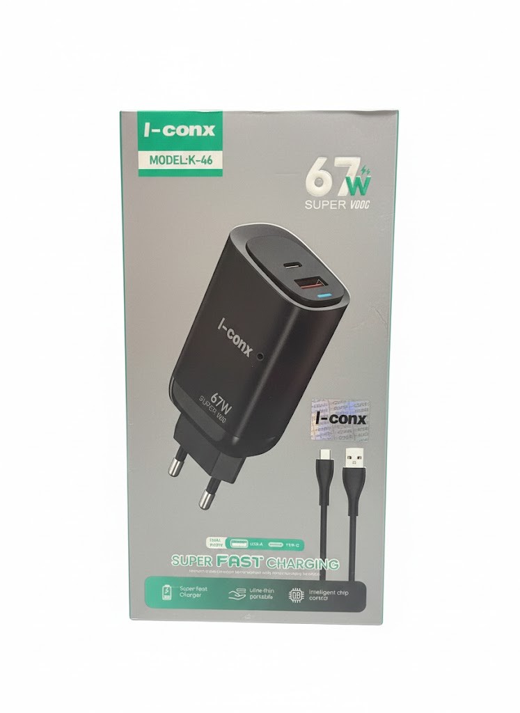 شاحن I-conX (أو Icconx) USB-PD هو شاحن جداري أو سيارة عالي الكفاءة، يتميز بقدرات شحن فائقة (غالباً 65 واط أو أكثر) تدعم تقنيات Power Delivery (PD) و Quick Charge (QC3.0). مصمم لمنح شحن سريع وآمن لأجهزة الكمبيوتر المحمولة، الأجهزة اللوحية، والهواتف الذكية عبر منافذ USB-C و USB-A، مع نظام حماية ذكي.