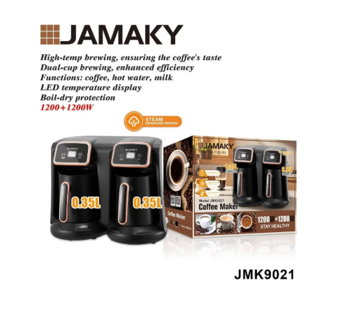 ماكينة قهوة جاماكي موديل JMK9021 هي ماكينة قهوة تركية رقمية بقوة 1200 واط وسعة 400 مل، مصممة لتحضير القهوة التركية التقليدية بكريمة غنية. تتميز بتصميم أنيق، وشاشة LED لعرض درجة الحرارة، ومستشعر رقمي لمنع فيضان القهوة. تشتمل أيضاً على خاصية التحذير الصوتي عند اكتمال التخمير، وقاعدة سهلة التنظيف، وخاصية الإيقاف التلقائي للحماية من الحرارة الزائدة.